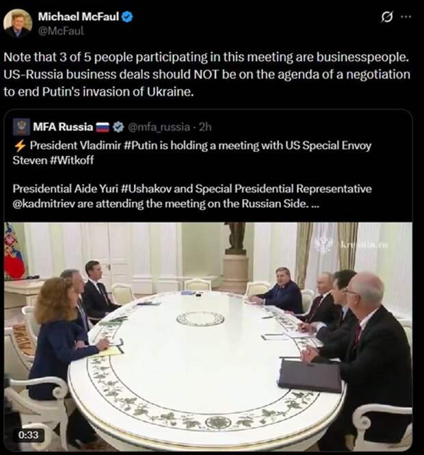 Экс-посол США в России Майкл Макфол потребовал не принимать во внимание переговоры американских и российских представителей, проходившие накануне в Кремле, и не признавать любые возможные достигнутые договоренности.