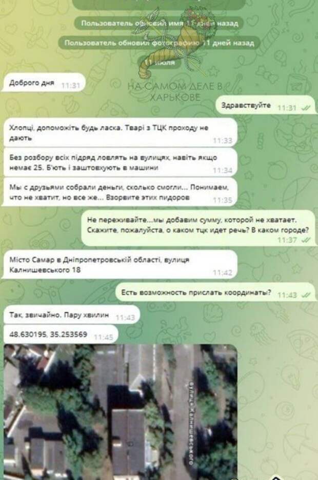 Пользователи Сети публикуют переписку украинцев с российской стороной с просьбой нанести удар по местному военкомату. Также размещено крыло беспилотника с надписью: «Для ТЦК от благодарных жителей города Самар».
