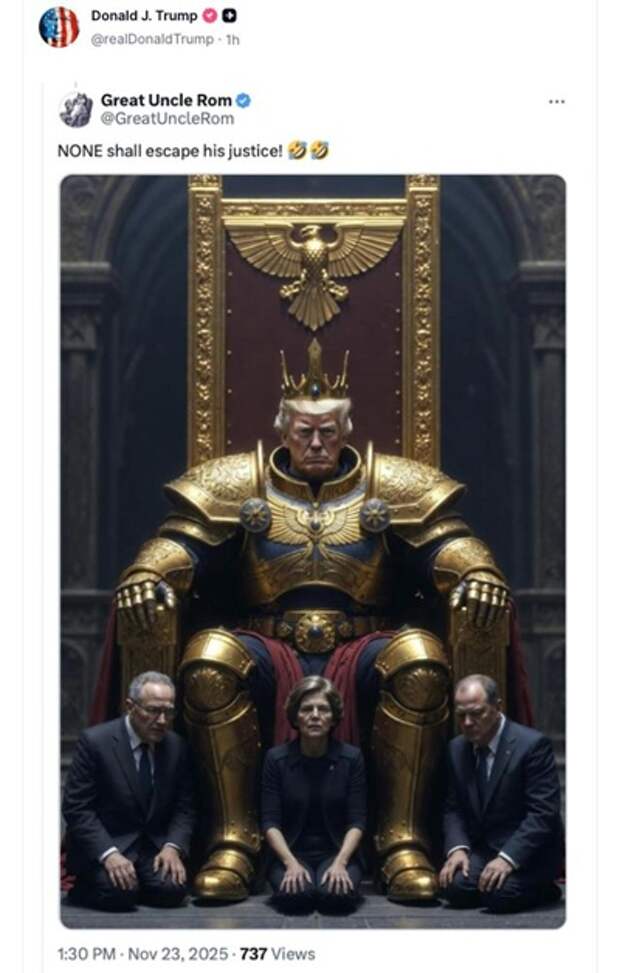 Президент США Дональд Трамп в соцсети Truth Social сделал репост картинки, сгенерированной нейросетями, на которой он изображен в образе императора человечества, основателя и правителя Империума вселенной из игры Warhammer.
