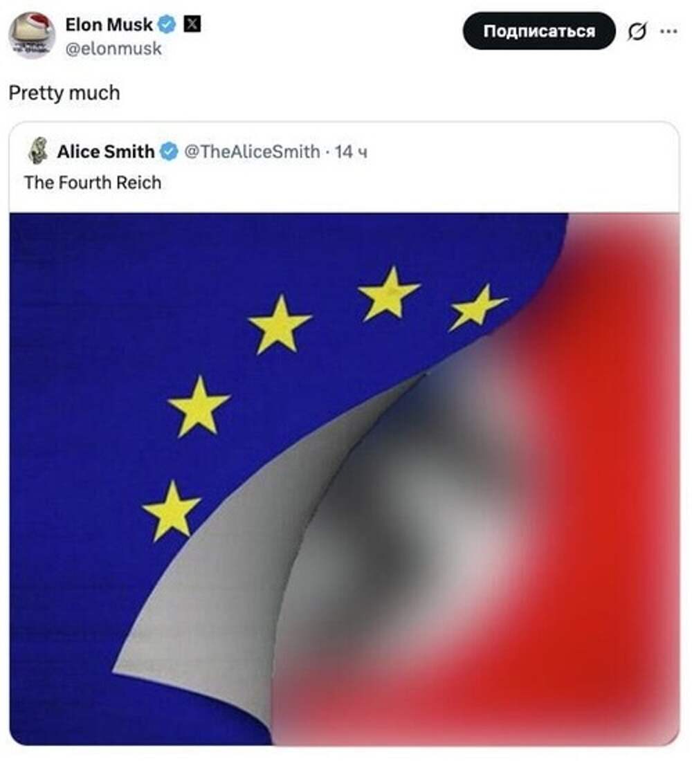 Илон Маск назвал Европу Четвертым рейхом. Бизнесмен сделал репост записи одного из пользователей с утверждением, что Европа — «Четвёртый рейх». «В значительной степени», — согласился Маск. Ранее он заявил о необходимости устранить Европейский союз и вернуть суверенитет отдельным странам.